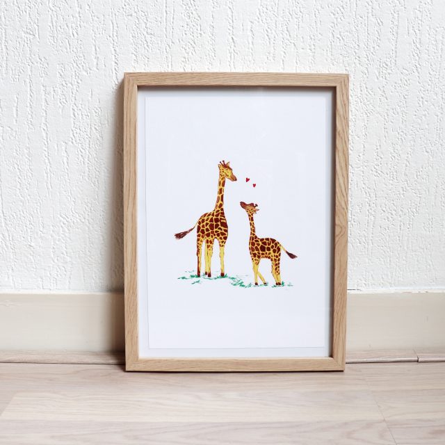 Twee schattige giraffes die elkaar liefhebben. Een leuke print om bijvoorbeeld op te hangen op de kinderkamer.