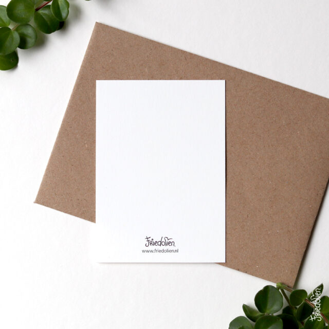 Dit kaartje is gemaakt van gebroken wit milieuvriendelijk papier. Het formaat van het kaartje is A7 (74 x105 cm), dit is de helft van een standaard formaat kaart (A6). De achterkant van het kaartje is blanco. Er zit geen envelop bij de kaart.
