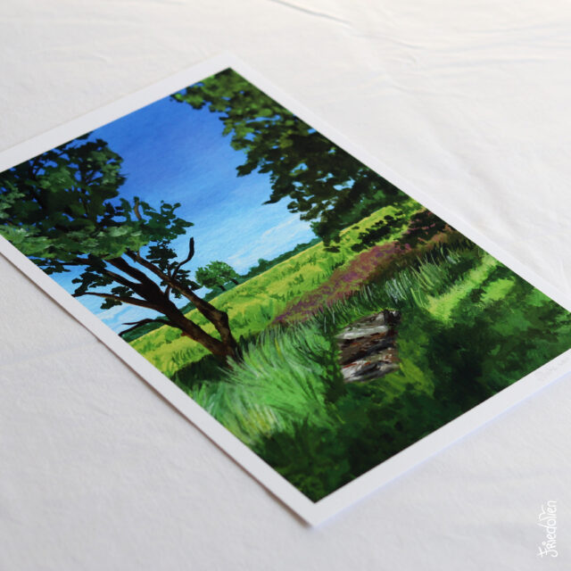 Ik schilderde dit landschap naar aanleiding van een foto die ik maakte op de hei in Drenthe. Een plek waar ik graag wandel. Het origineel schilderde ik met gouache op papier.