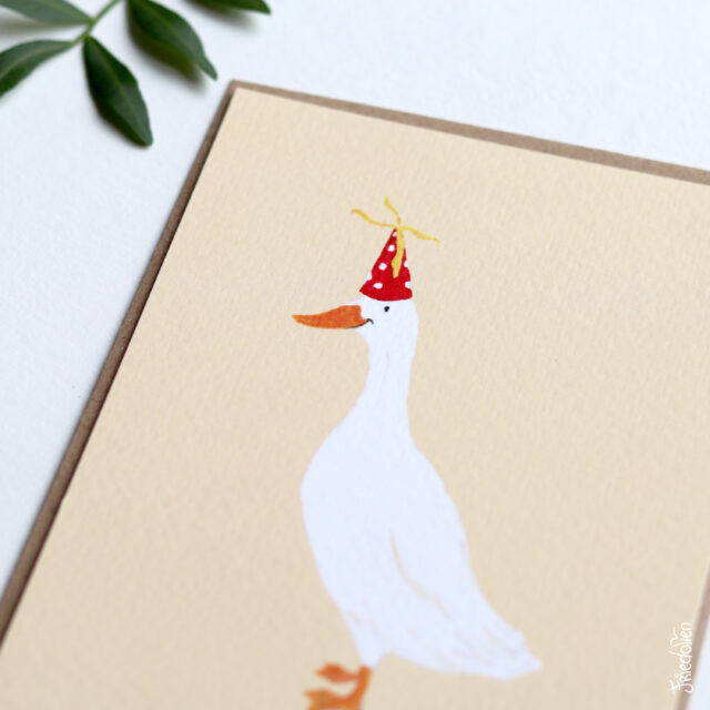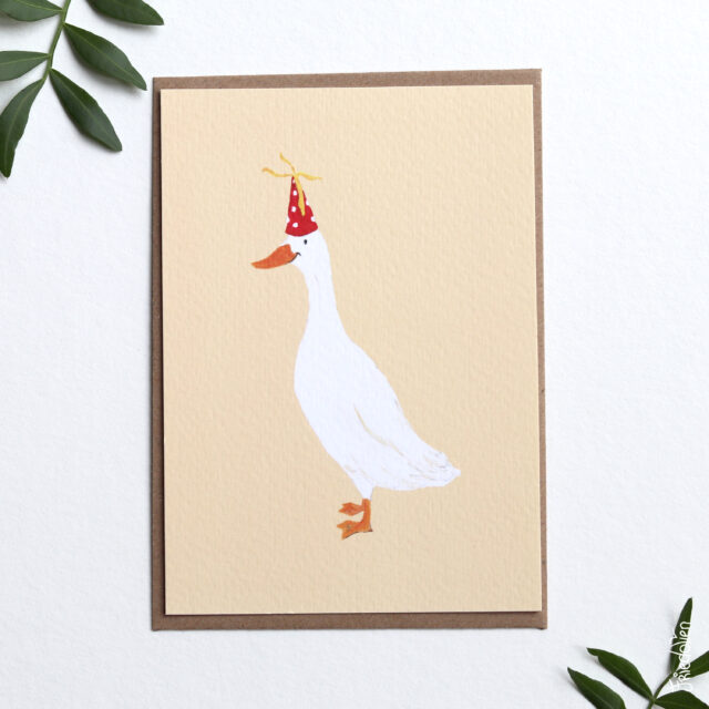 Kaart met illustratie van vrolijke loopeend met feestmuts. Deze kaart is gemaakt van stevig papier met een lichte structuur en heeft een blanco achterkant. Je kunt eventueel een envelop van duurzaam bruin kraft papier toevoegen aan de kaart.