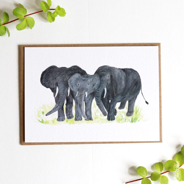 Drie blije olifanten. Een lief kaartje dat bijvoorbeeld leuk is om te versturen voor een geboorte.