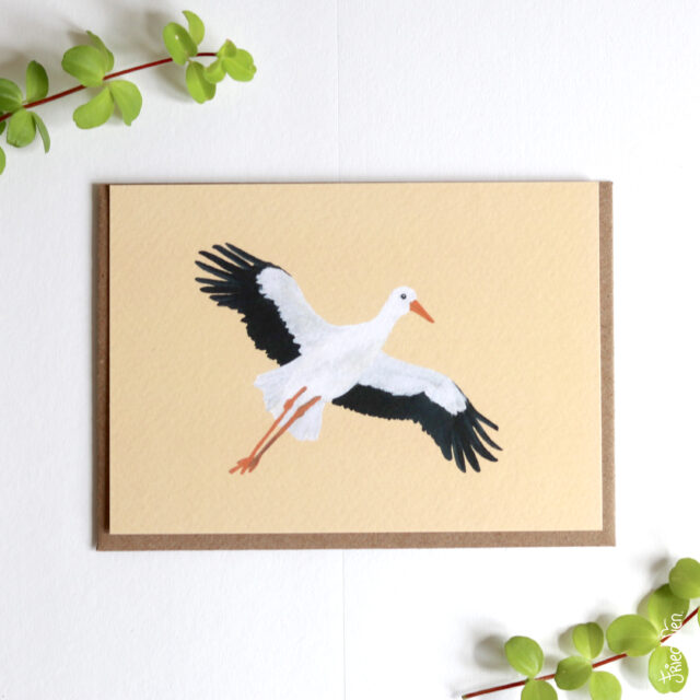 Deze lieve vliegende ooievaar brengt graag een felicitatie voor een geboorte over.
