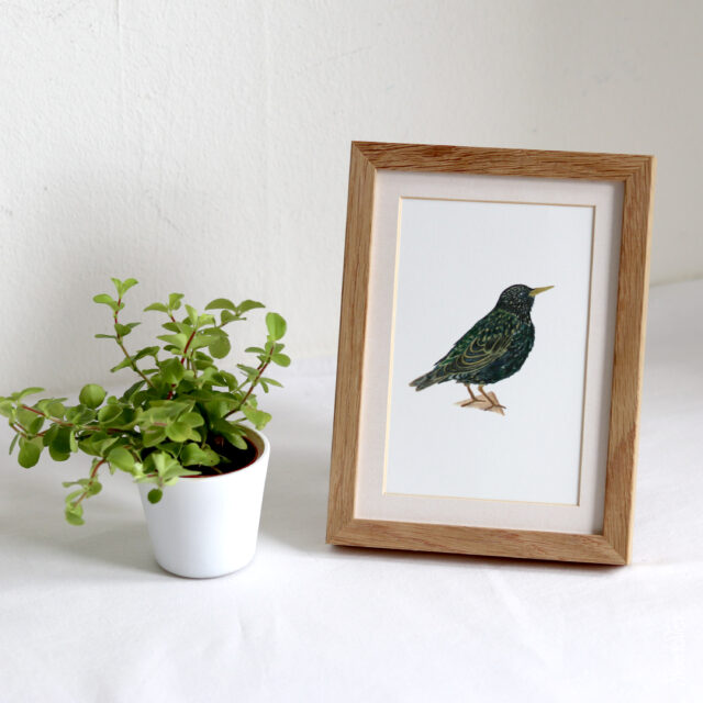 De spreeuw is onderdeel van de collectie Tien Tuinvogels. In deze serie illustraties, schilderde ik tien verschillende tuinvogels met gouache. Deze heb ik vervolgens gedigitaliseerd en laten drukken op milieuvriendelijk papier.