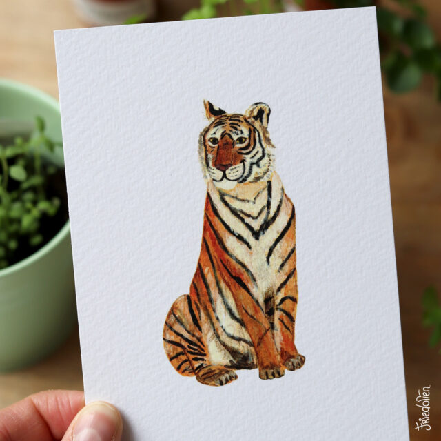 Ik schilderde deze tijger voor het dierenalfabet, een persoonlijk project waarvoor ik 26 verschillende dieren schilderde die samenkomen op een dierenalfabetposter. Deze poster en andere dierenkaarten vind je ook in de shop.