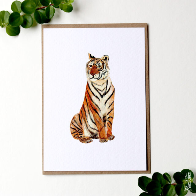 Kaart met tijger illustratie. Deze kaart is gemaakt van stevig papier met een lichte structuur en heeft een blanco achterkant. Je kunt eventueel een envelop van duurzaam bruin kraft papier toevoegen aan de kaart.