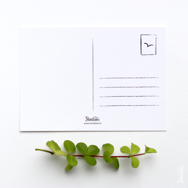 De kaart is gemaakt van stevig papier met een lichte structuur erin. Op de achterkant staan lijntjes voor een adres.