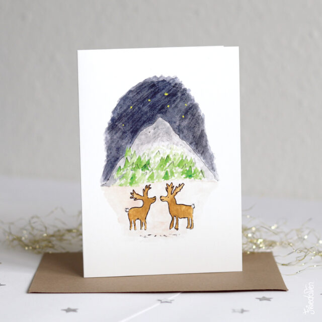 Gevouwen kerstkaart met twee rendieren die zich gelukkig voelen in de sneeuw onder een prachtige sterrenhemel.