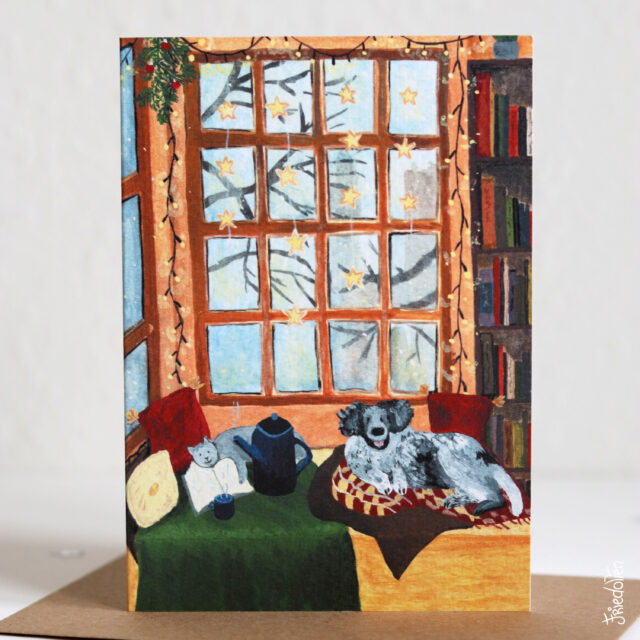 Met deze kerstkaart hoop ik je een knus thuis gevoel te geven. Op een koude winterdag binnen met gezellige kaarsjes en lichtjes aan naar buiten turen, een warme kop thee erbij en genieten van een goed boek.