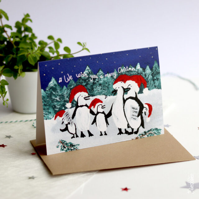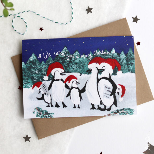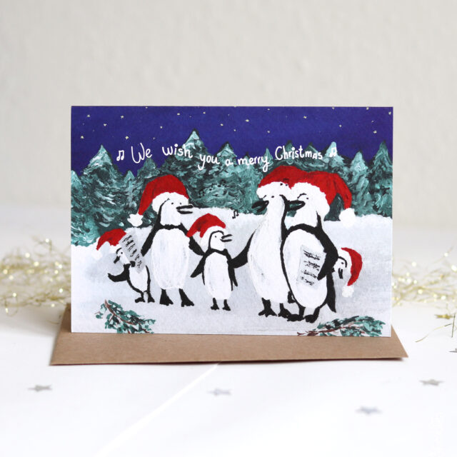 Deze vrolijke pinguïns zingen ‘We wish you a merry Christmas!’ en wensen jou fijne kerstdagen.