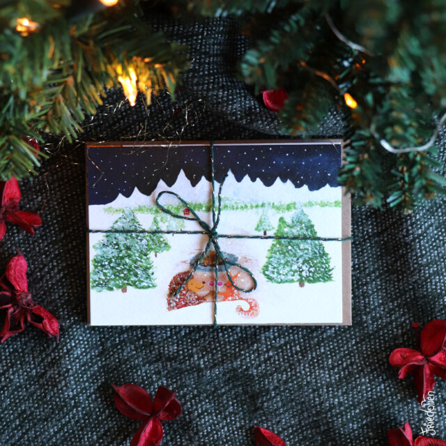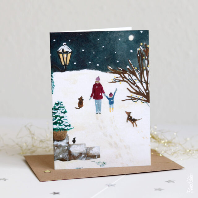 1x gevouwen kaart kampvuur in de sneeuw – met envelop
