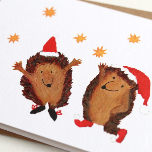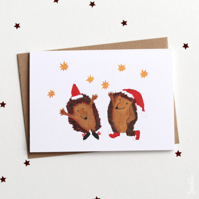 Set met 5 of 10 dezelfde gevouwen kerstkaarten. De egeltjes strooien lichtpuntjes, omdat iedereen wel een lichtpuntje in zijn leven kan gebruiken.