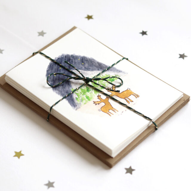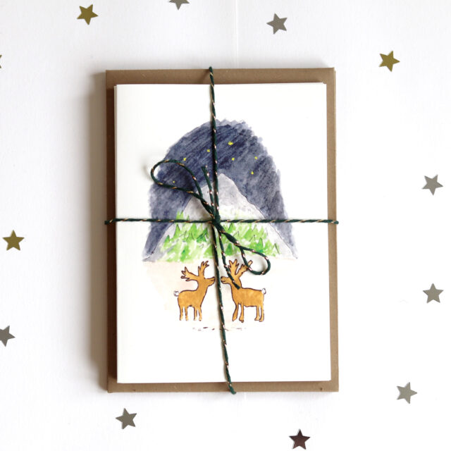 Deze kerstkaarten set bestaat uit zes gevouwen kerstkaarten met enveloppen van gerecycled papier.