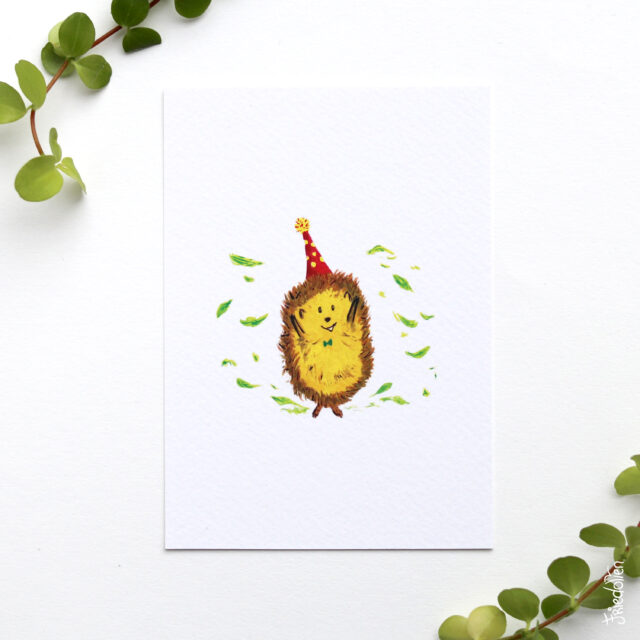 Hiep hiep hoera! Deze egel is blij, omdat het feest is! Een lief en schattig kaartje voor een verjaardag of ander feestje. De kaart is gemaakt van stevig en luxe papier met een structuur.